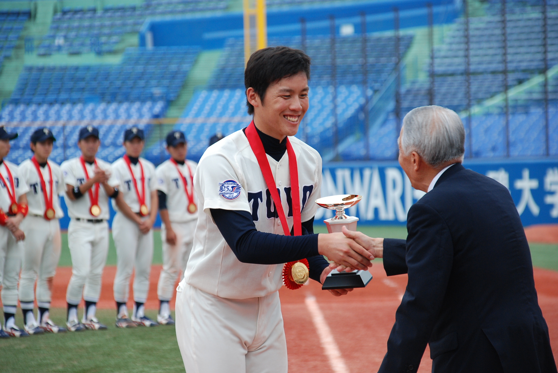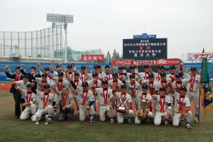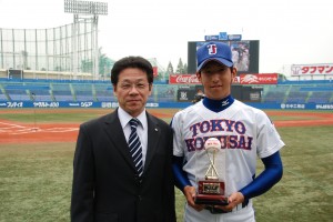 東洋大学藤岡選手は昨年に引き続き、最高殊勲選手賞と最優秀投手賞のW受賞。首位打者賞には九州共立大学の佐藤選手が、敢闘賞には慶応義塾大学の福谷選手が受賞しました。