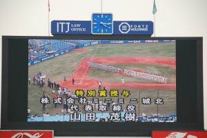 また特別賞には創部47年で初の全国大会出場をし準決勝まで勝ちすすんだ東京国際大学が受賞しました。この特別賞には今大会を微力ながらサポートさせて頂いた私どもミニミニグループを代表して、株式会社ミニミニ城北の代表取締役山田茂樹から記念ボールを贈呈させて頂きました。