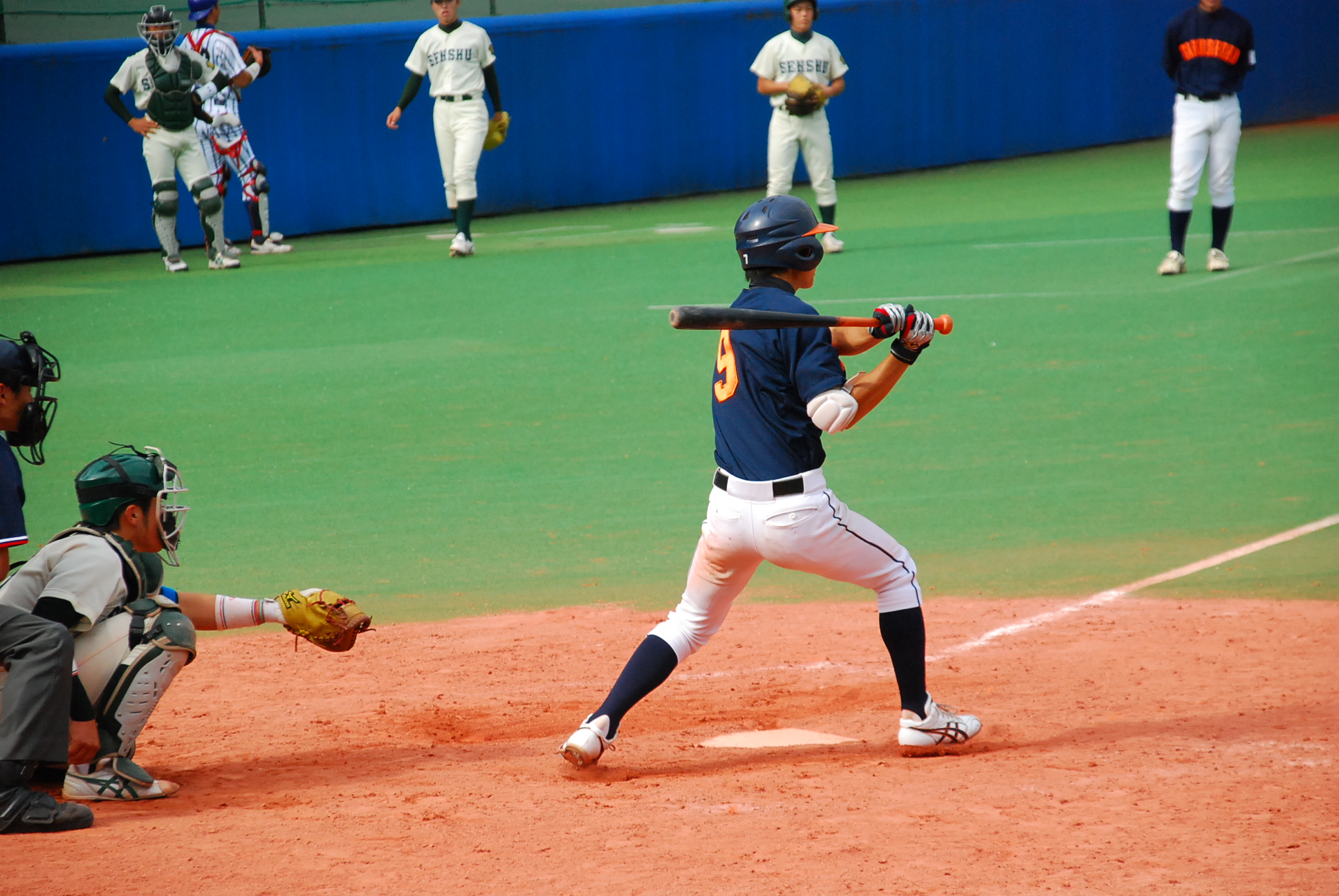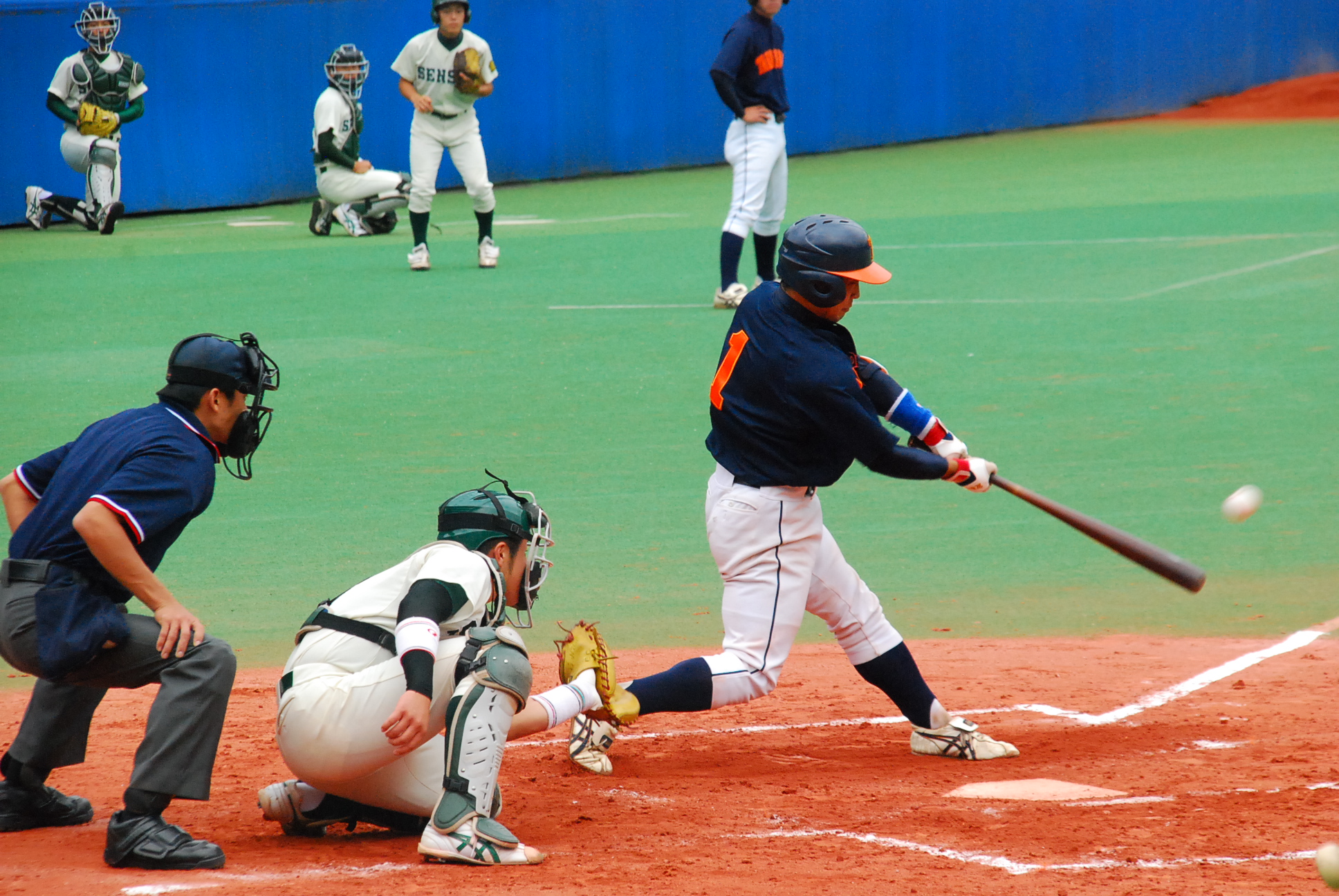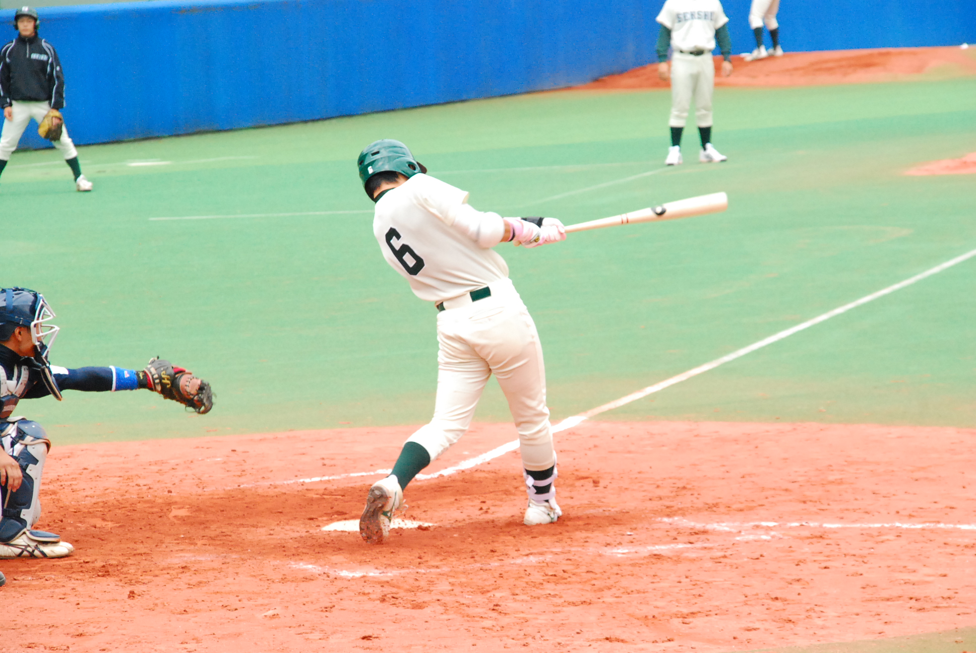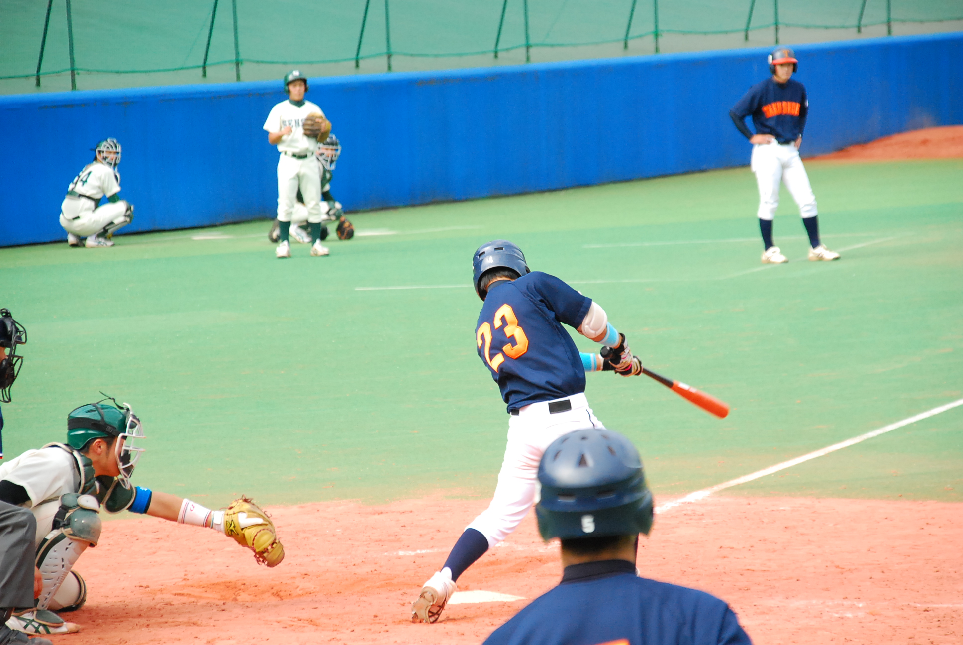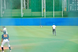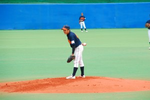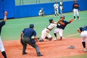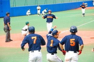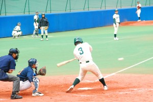 試合は1回から動きます。1回表を1安打で抑えた拓殖大学はその裏、1番・野添選手がセンター前ヒットで出塁し、貴重なノーアウトのランナーを得ます。続く2番・小橋選手はきっちり送り、これで1アウト2塁の絶好の先取点のチャンス。ここで3番・山下選手に期待がかかりますが、あえなく三振。2アウトとします。続く4番・馬淵選手は四球を選ぶと、続くバッターはキャッチャーで主将の浦選手。内角低めのボールに食らいつき、放たれた打球はレフトのライン際を転がる2塁打に。このヒットで2塁から一気に野添選手がホームに還り、拓殖大学が優勝を引き寄せる貴重な先取点を奪います。