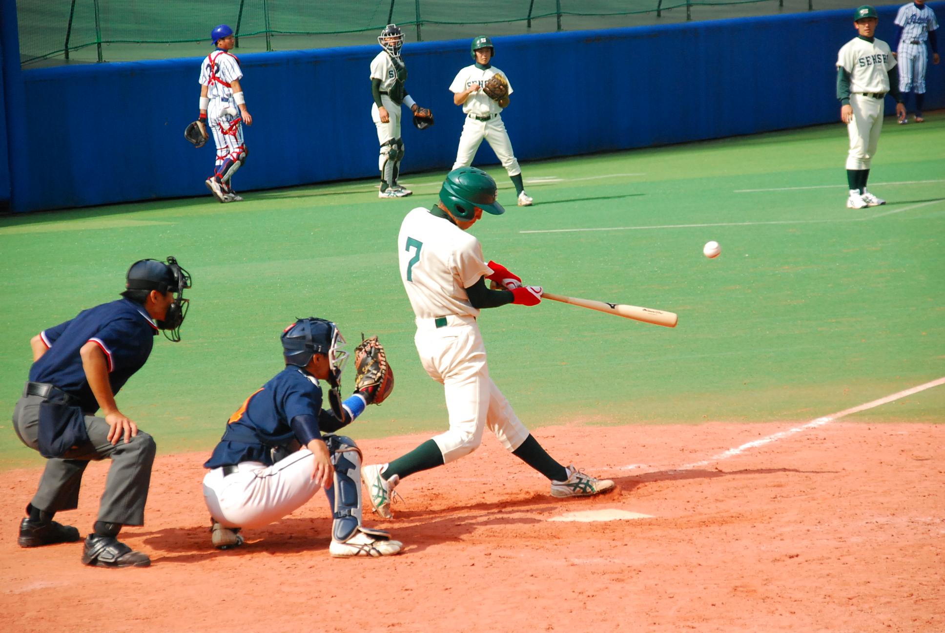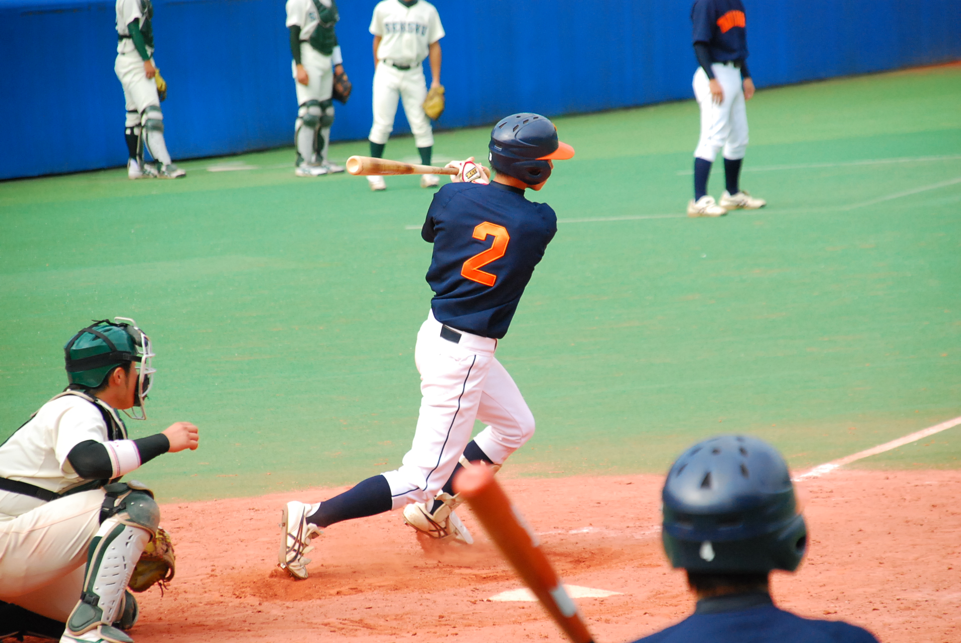 初回の先取点で、試合の流れは拓殖大学に傾くかに思われましたが、2回以降、攻撃はちぐはぐ。逆に意地を見せたい専修大学は4回表、この回先頭の5番DH・大久保選手がライト前ヒットで出塁すると、6番・鈴木選手が送りバントを成功させ、1アウト2塁と同店のチャンスを作ります。7番・稲角選手は石橋投手の前に三振を喫するも、続くバッターは明徳義塾高校時代、石橋投手の球を受け続けてきた河合選手。高校時代のバッテリーが敵味方に分かれ、対戦した結果は河合選手に軍配。センターの頭上を越えるタイムリー2塁打で、専修大学が同点に追いつきました。
