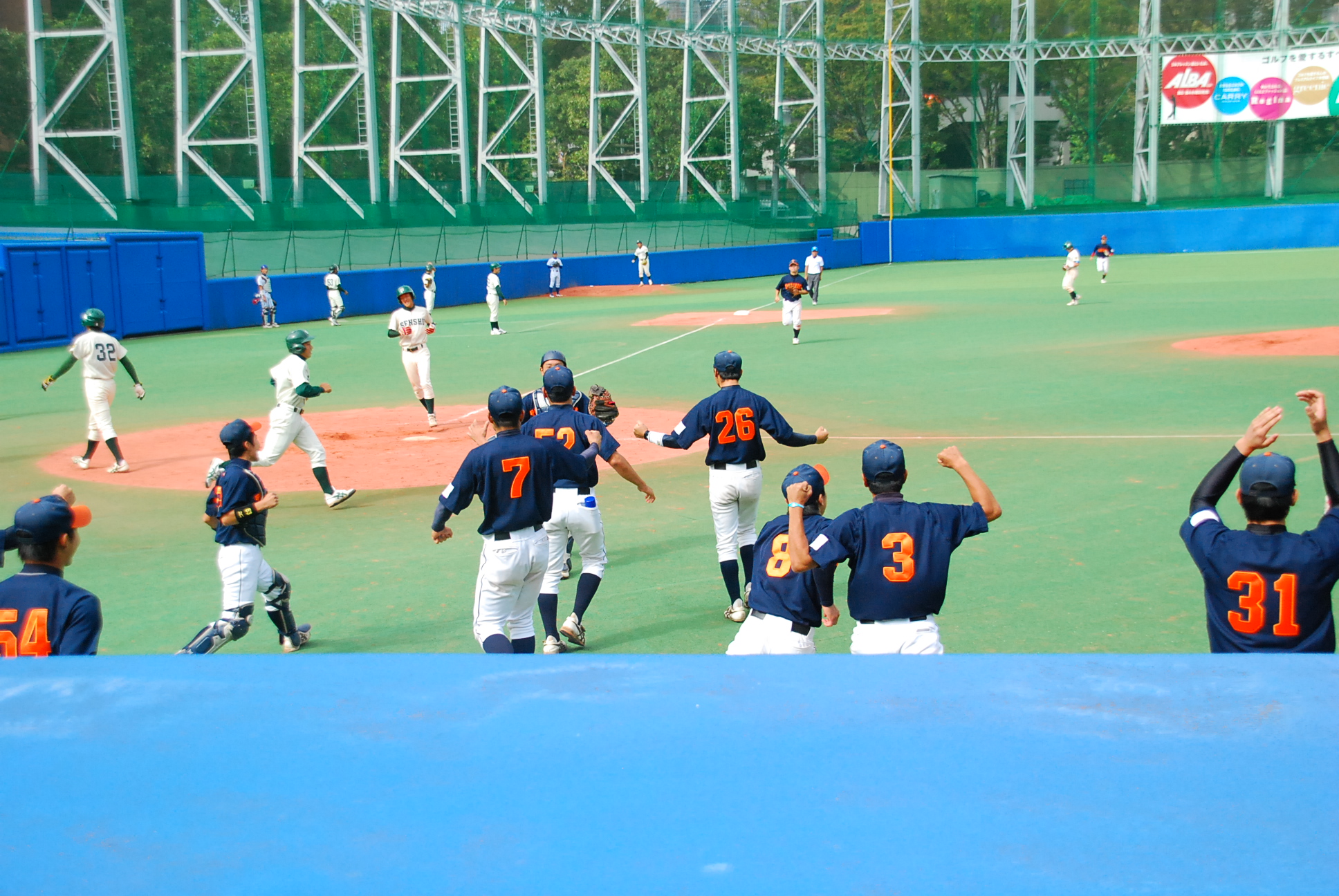 ピンチの後にはチャンスあり。拓殖大学は簡単に2者が打ち取られるも、1番・野添選手が左中間を破る2塁打で出塁すると、続く2番・小橋選手もレフト前ヒットで続き、2アウトながら1・3塁のサヨナラのチャンを作ります。この連打に拓殖大学スタンドのボルテージは最高潮。3番・山下選手に全て託します。期待を一身に背負った山下選手。観客席が一球一球に視線を集中させる中、見逃せばボールとなりそうな低めの変化球を一閃。打球はショートを抜けるセンター前ヒット。3塁から悠々野添選手がホームインし、拓殖大学が劇的な1-2のサヨナラ勝ちで、2部秋季リーグの優勝を決めました。