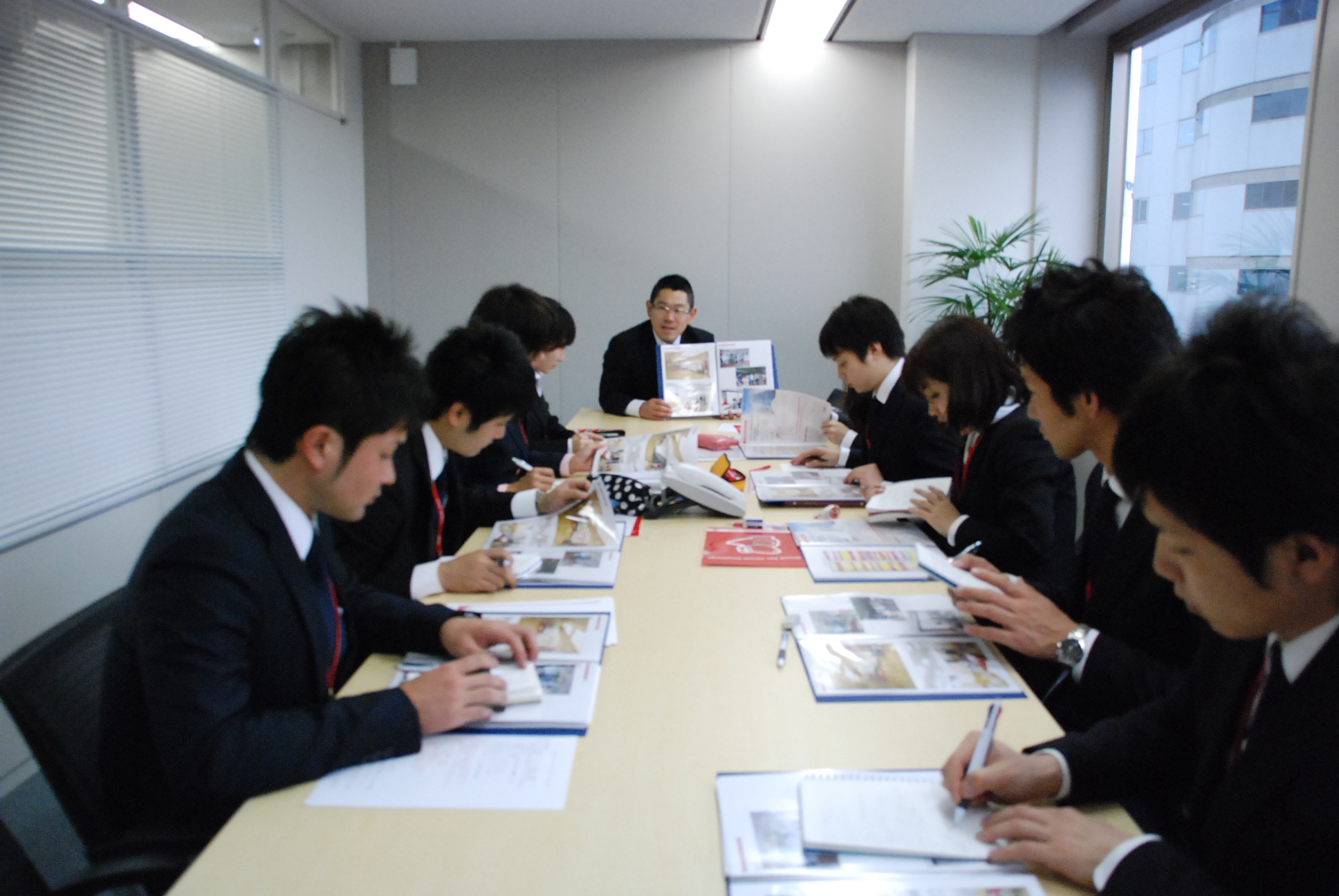 午後からは営業部課長の伊藤が講師を務め、講義だけでなく、新入社員同士でペアを組みそれぞれがオーナー様役を演じ、実際にご提案の練習をする実践研修を行いました。