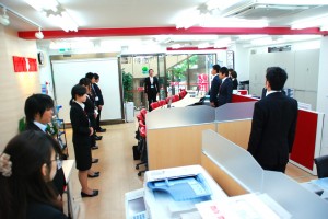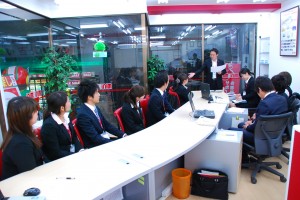 実習の本部となるミニミニ三鷹店。営業部の伊藤課長による指揮で朝礼が行われ、接客業で重要な「挨拶」の訓練なども行いました。