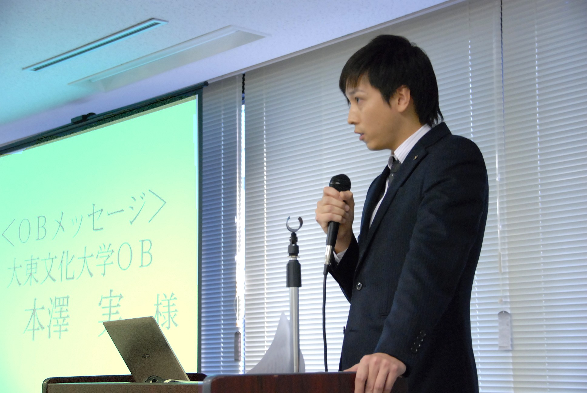 「就職講座」の後には大学ハンドボール界から巣立ち、社会人として活躍する人材からのメッセージとして「OBメッセージ」が行なわれました。この「OBメッセージ」では、現役時代は大東文化大学ハンドボールで主将を務め、現在はミニミニ城北 赤羽店で活躍する本澤次長が、これから就職活動に励む後輩達に、自らの就職活動における体験談を語りました。