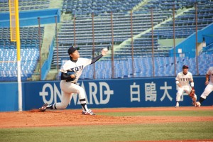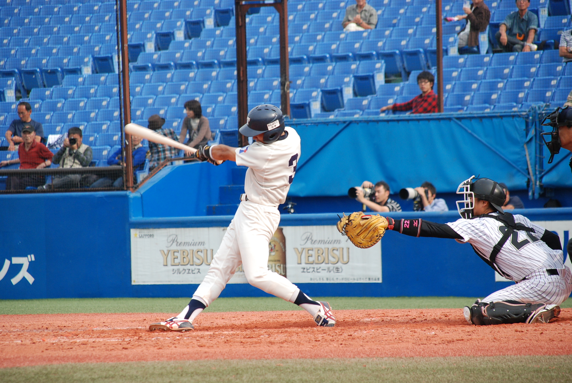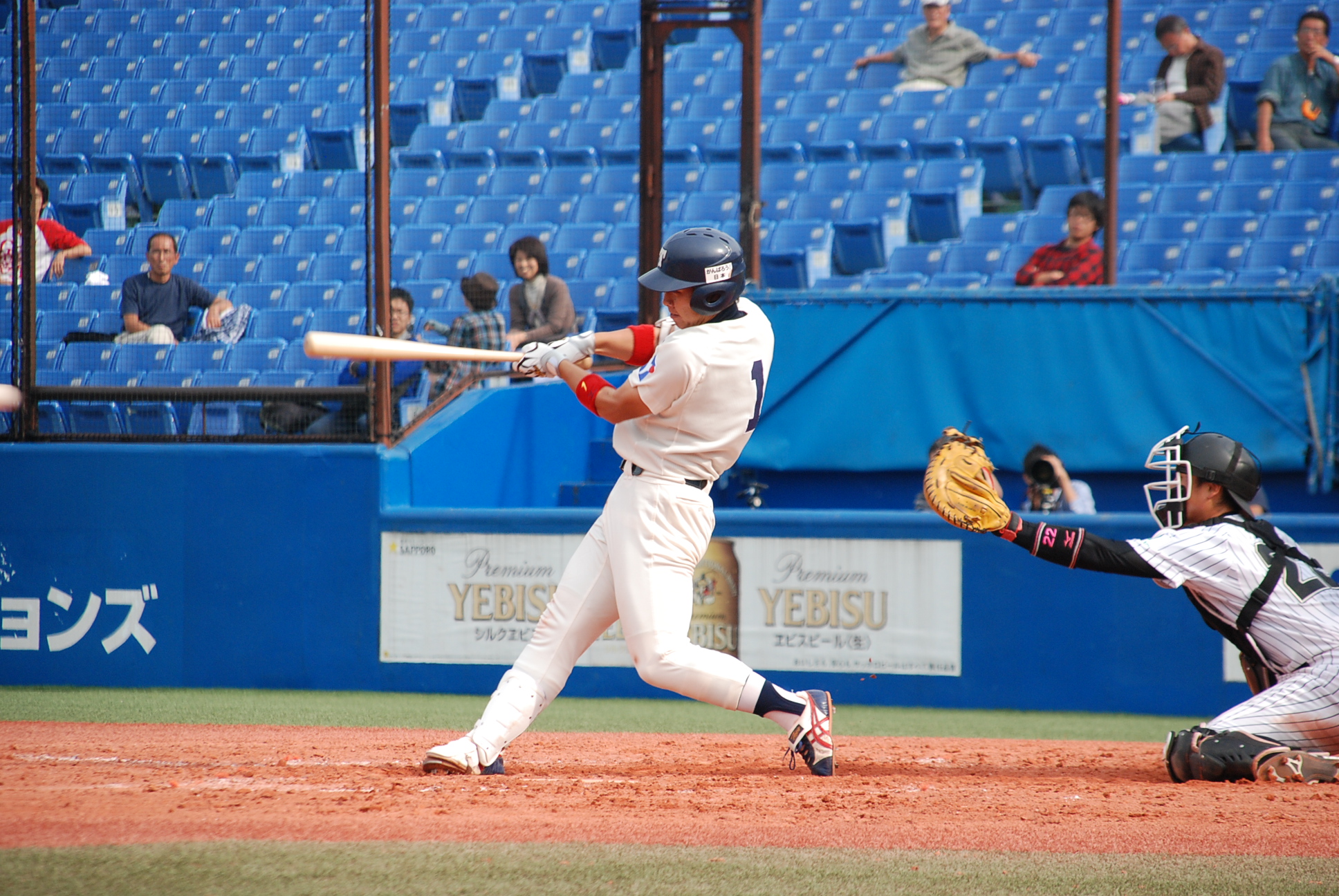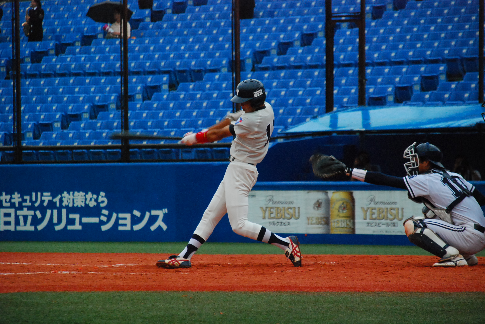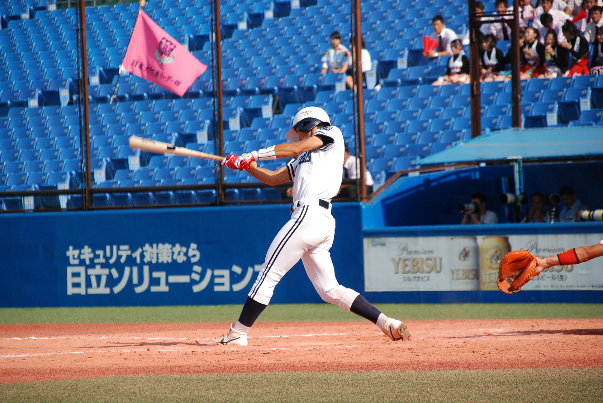 その裏、日本大学は1番・平選手はセンターフライに倒れるも、2番・谷選手が初球をレフト前に運び出塁すると、立ち上がり不安定な藤岡投手がまさかのボーク。谷選手は2塁へ進みます。3番・井上選手は三振を喫すも、決め球の変化球をキャッチャー・岡選手が弾き、振り逃げ成功。この間に谷選手は3塁へ。続く4番・村田選手は打球をレフトに掬い上げると、これが貴重な同点犠牲フライとなり日本大学がすぐさま追いつきます。