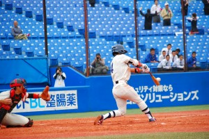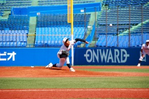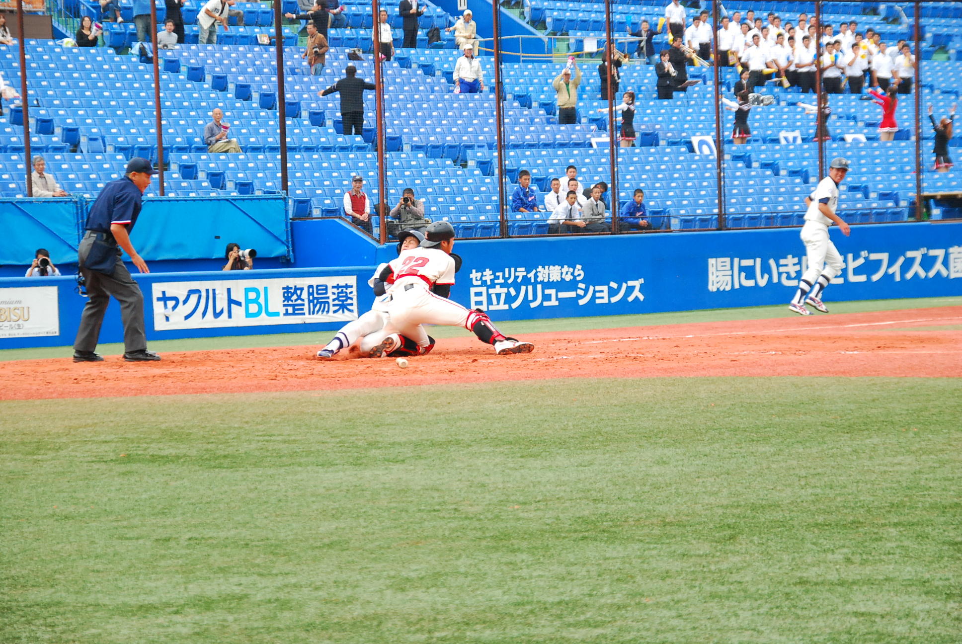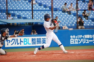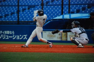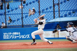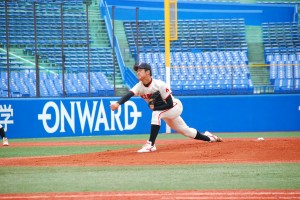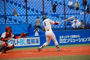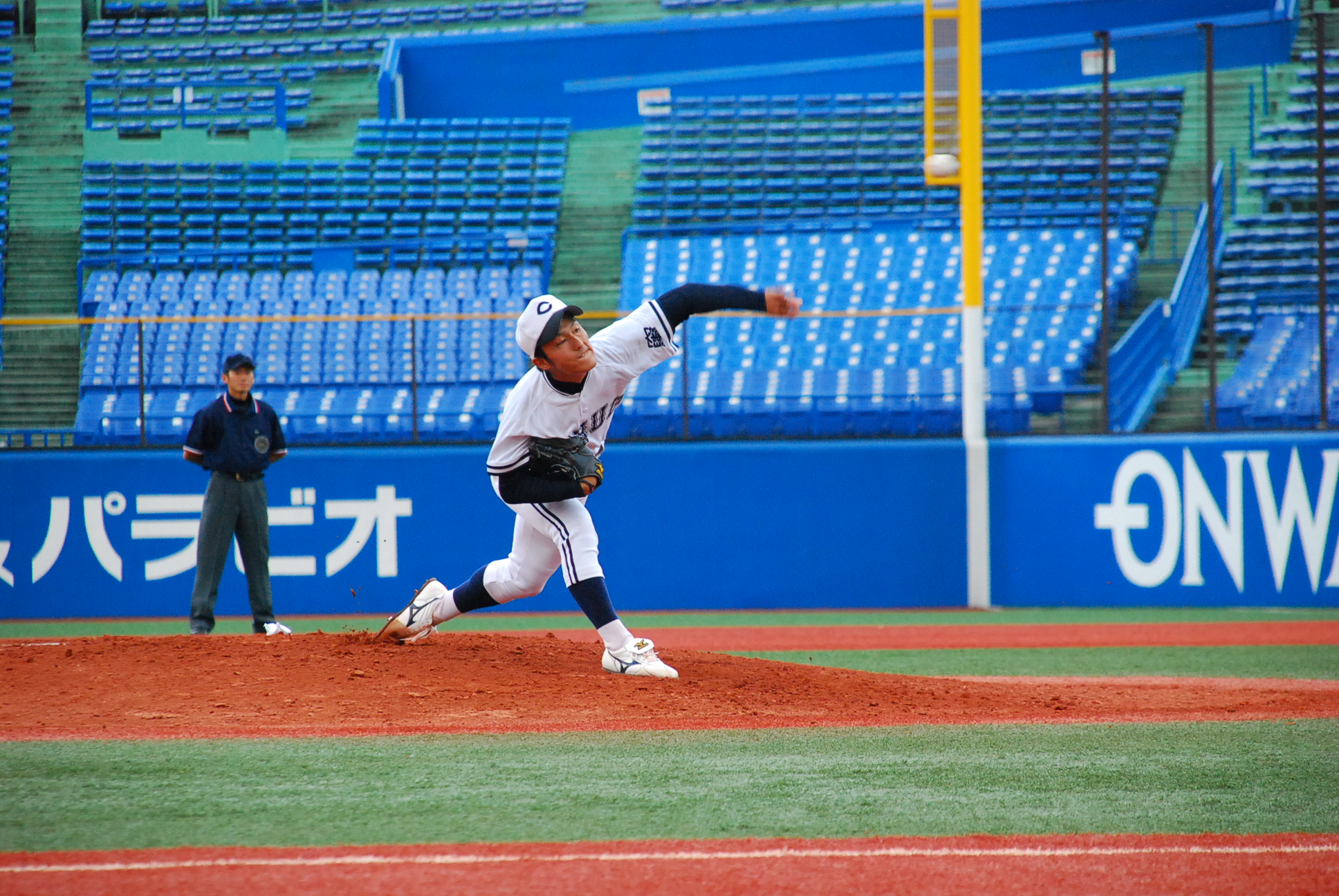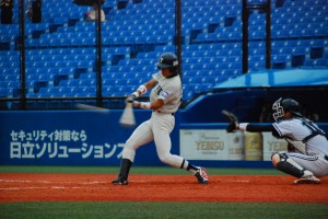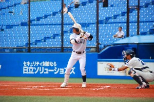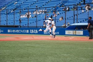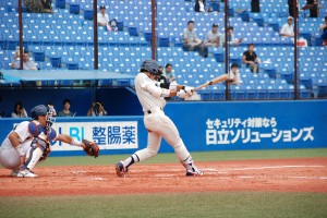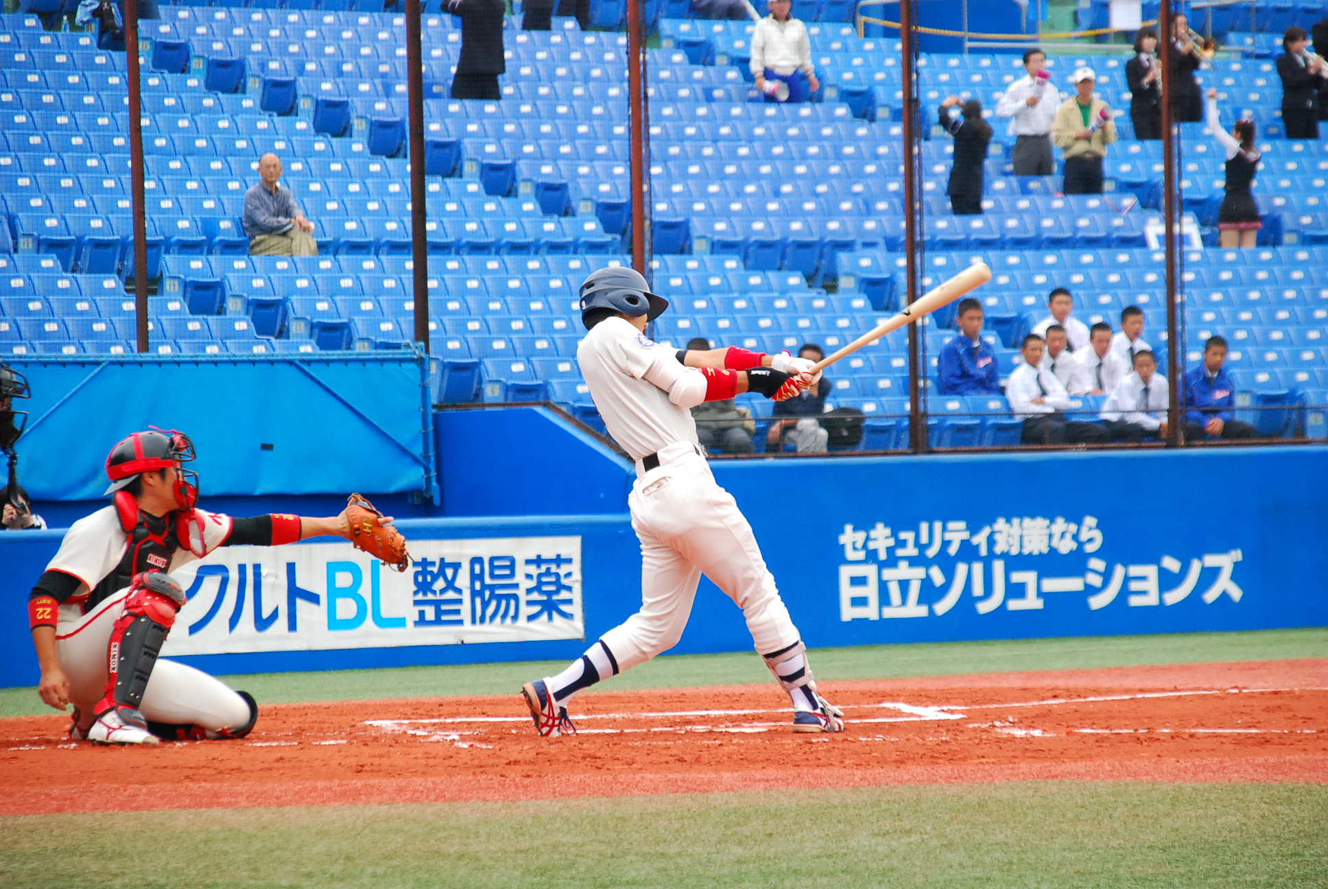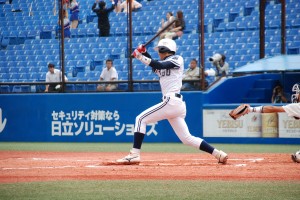 その裏、日本大学は1番・平選手はセンターフライに倒れるも、2番・谷選手が初球をレフト前に運び出塁すると、立ち上がり不安定な藤岡投手がまさかのボーク。谷選手は2塁へ進みます。3番・井上選手は三振を喫すも、決め球の変化球をキャッチャー・岡選手が弾き、振り逃げ成功。この間に谷選手は3塁へ。続く4番・村田選手は打球をレフトに掬い上げると、これが貴重な同点犠牲フライとなり日本大学がすぐさま追いつきます。
