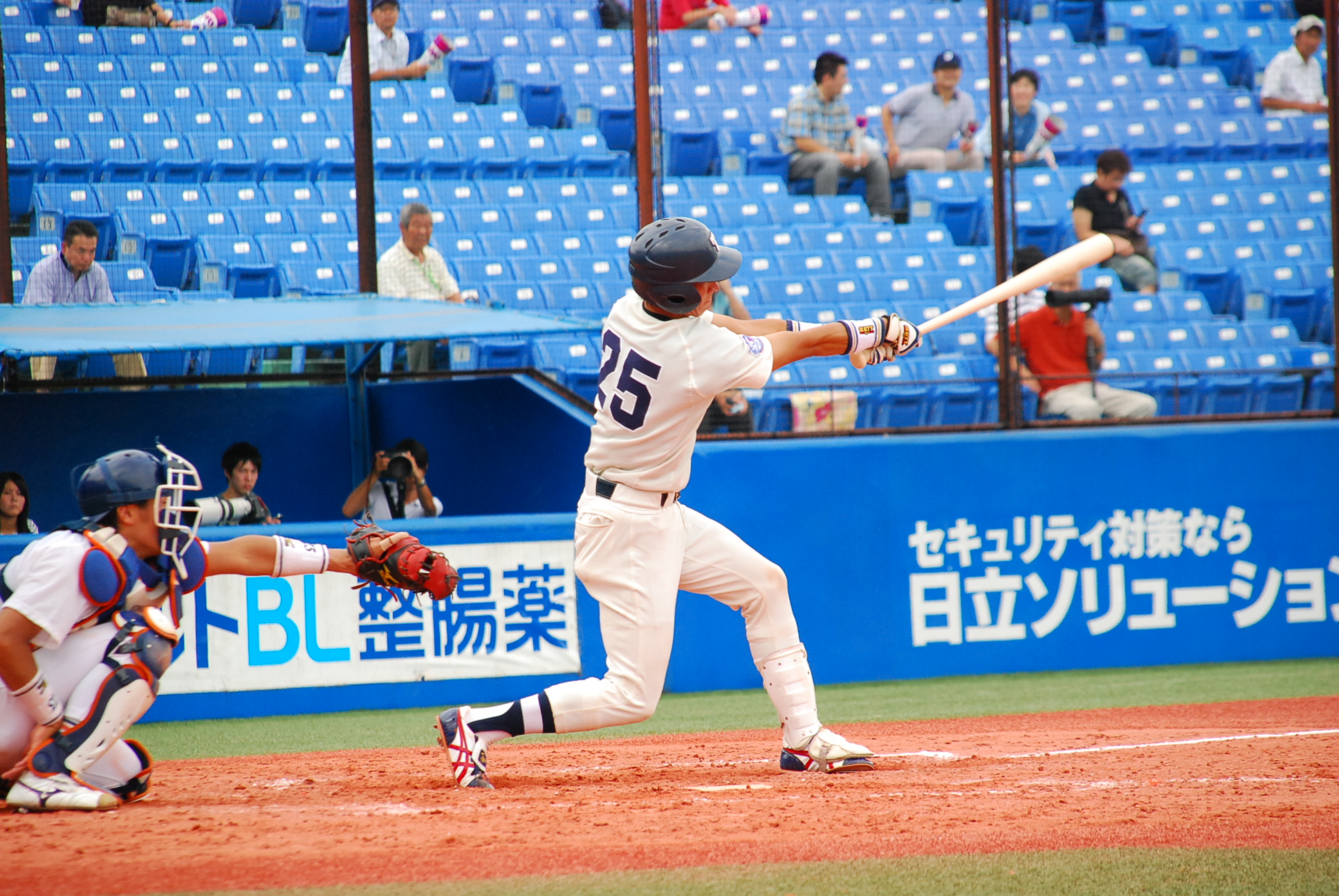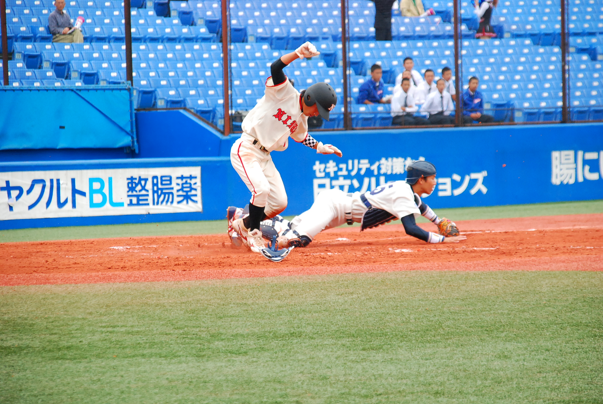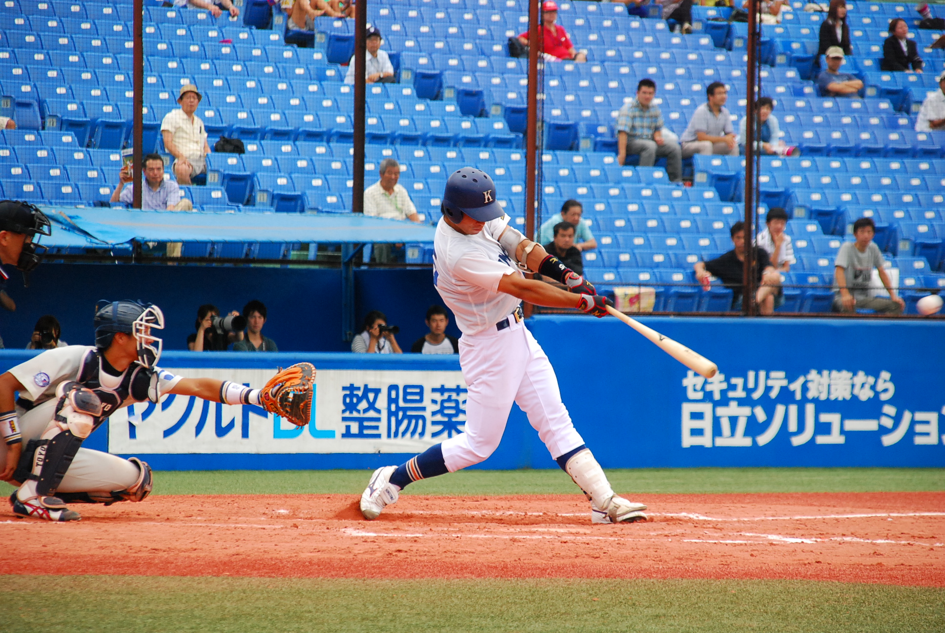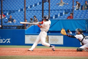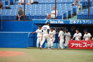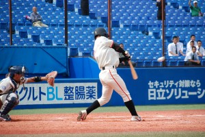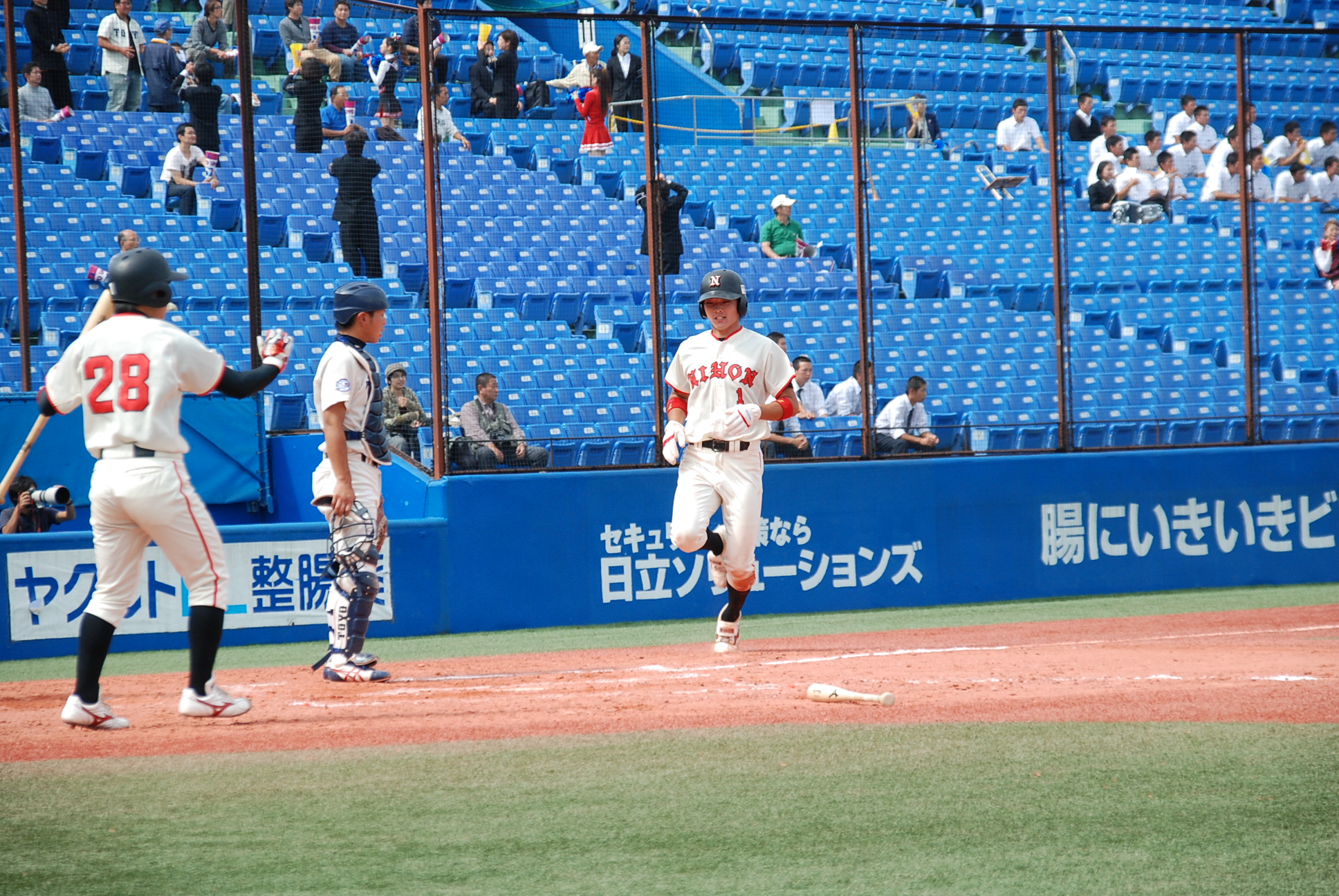 その裏、日本大学は1番・平選手はセンターフライに倒れるも、2番・谷選手が初球をレフト前に運び出塁すると、立ち上がり不安定な藤岡投手がまさかのボーク。谷選手は2塁へ進みます。3番・井上選手は三振を喫すも、決め球の変化球をキャッチャー・岡選手が弾き、振り逃げ成功。この間に谷選手は3塁へ。続く4番・村田選手は打球をレフトに掬い上げると、これが貴重な同点犠牲フライとなり日本大学がすぐさま追いつきます。