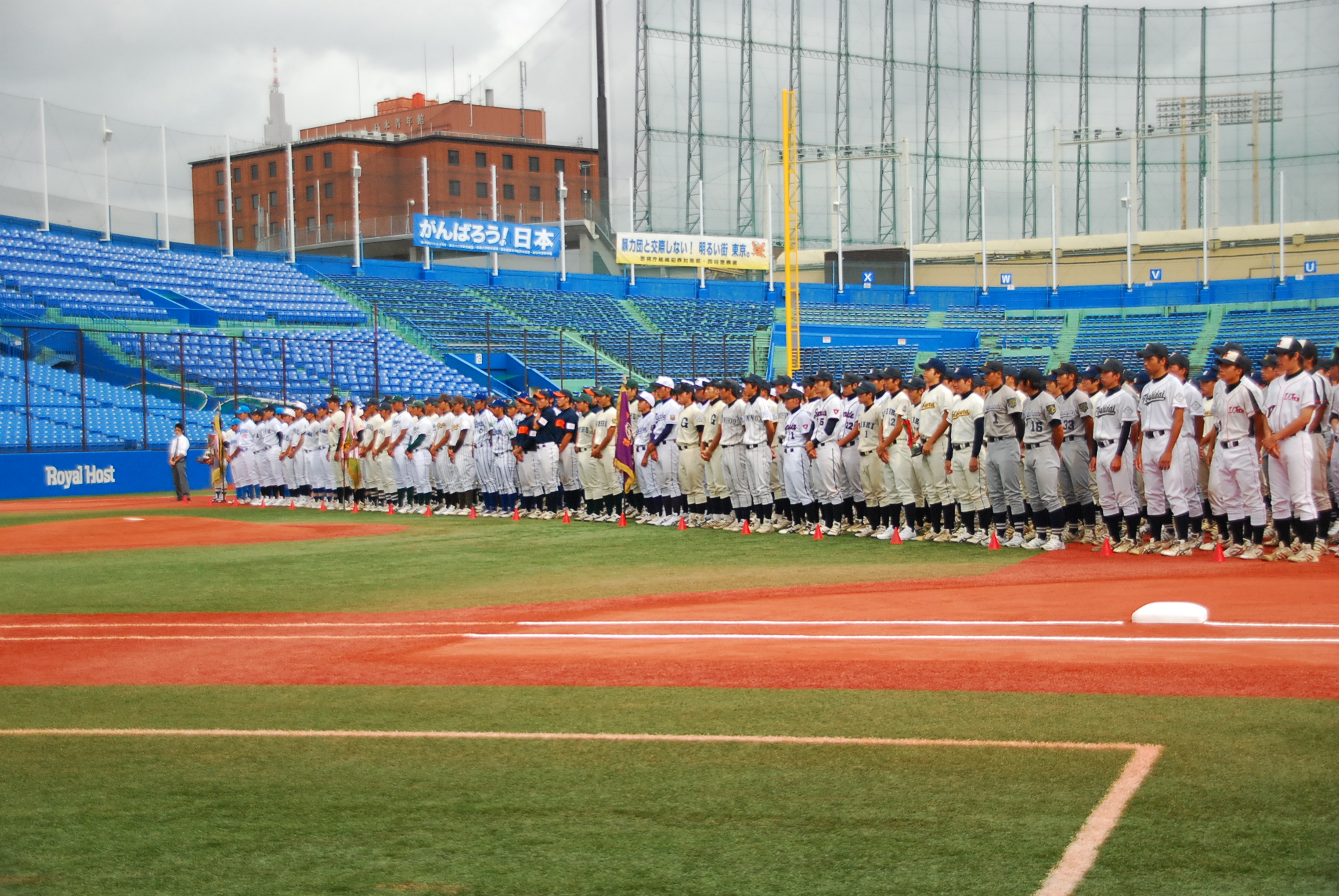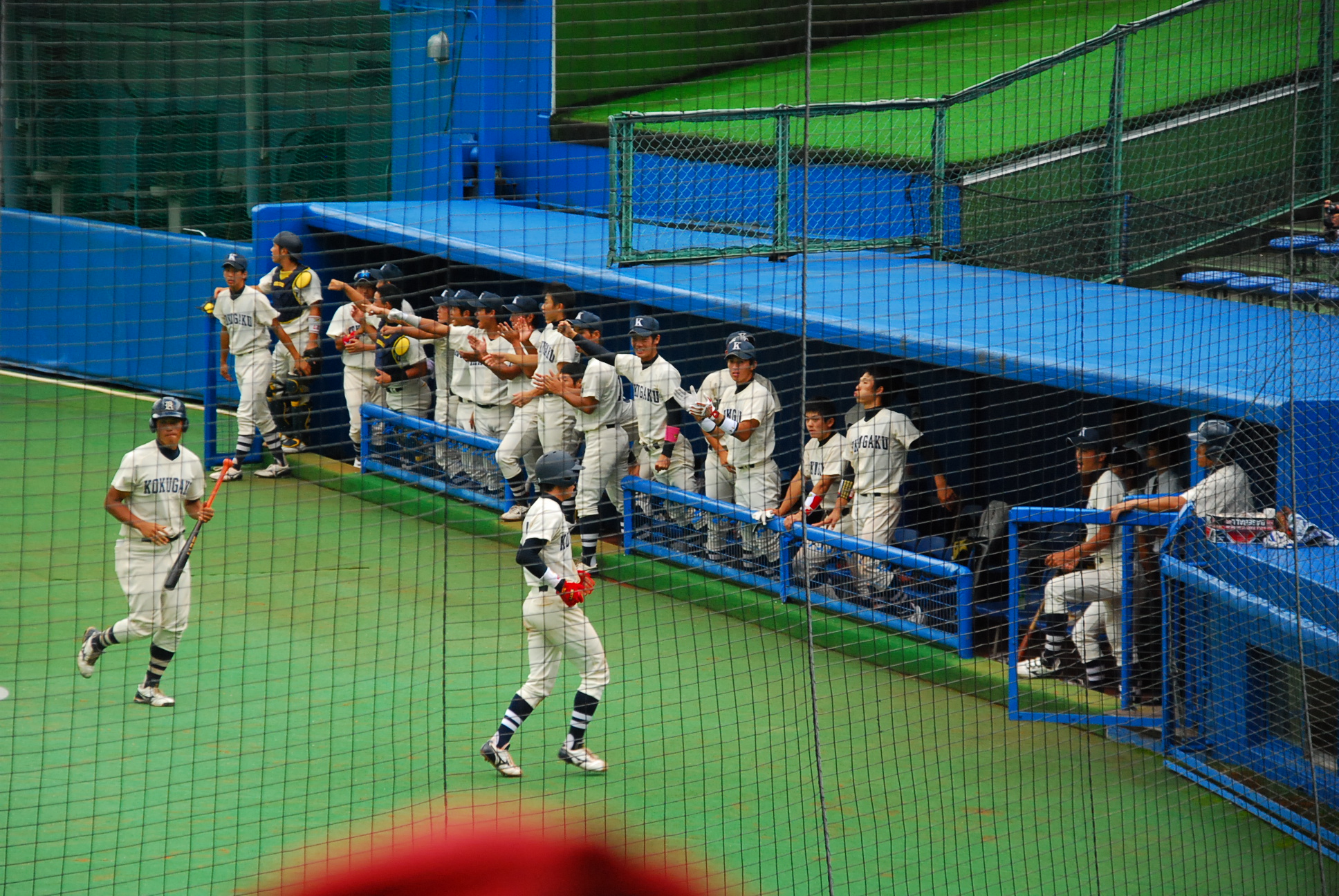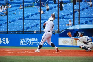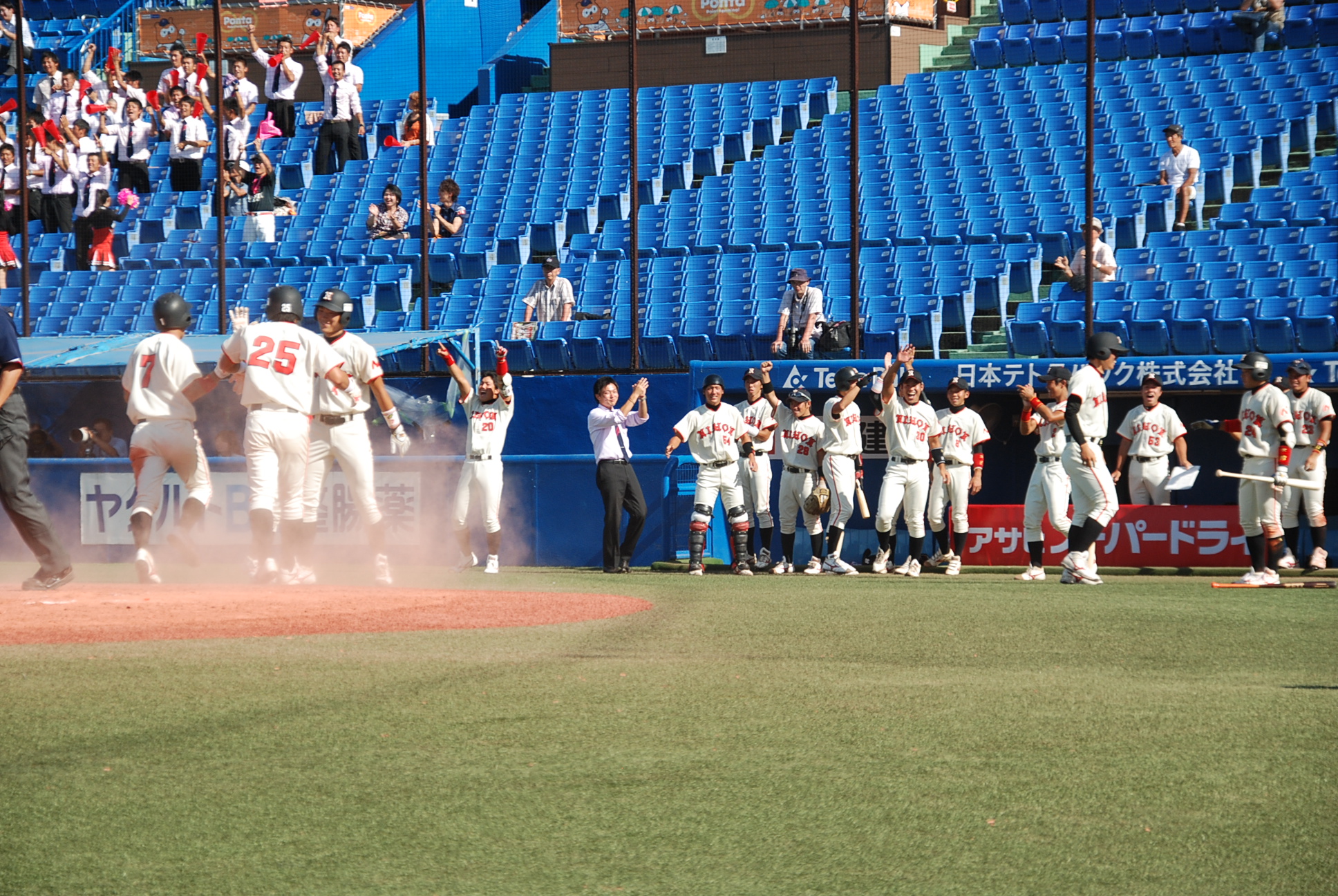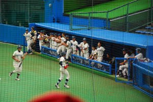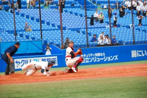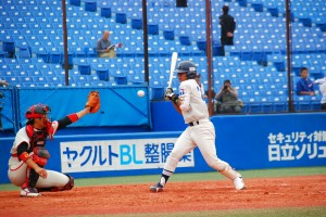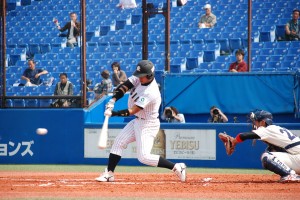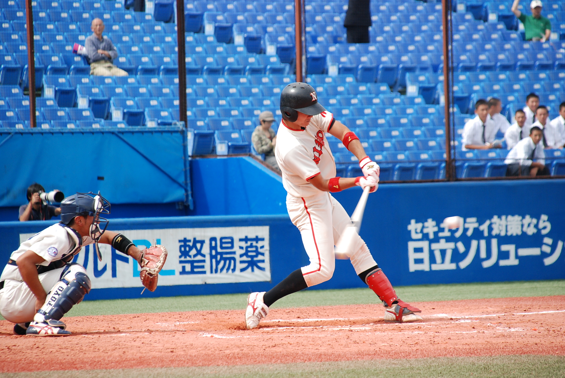 その裏、日本大学は1番・平選手はセンターフライに倒れるも、2番・谷選手が初球をレフト前に運び出塁すると、立ち上がり不安定な藤岡投手がまさかのボーク。谷選手は2塁へ進みます。3番・井上選手は三振を喫すも、決め球の変化球をキャッチャー・岡選手が弾き、振り逃げ成功。この間に谷選手は3塁へ。続く4番・村田選手は打球をレフトに掬い上げると、これが貴重な同点犠牲フライとなり日本大学がすぐさま追いつきます。