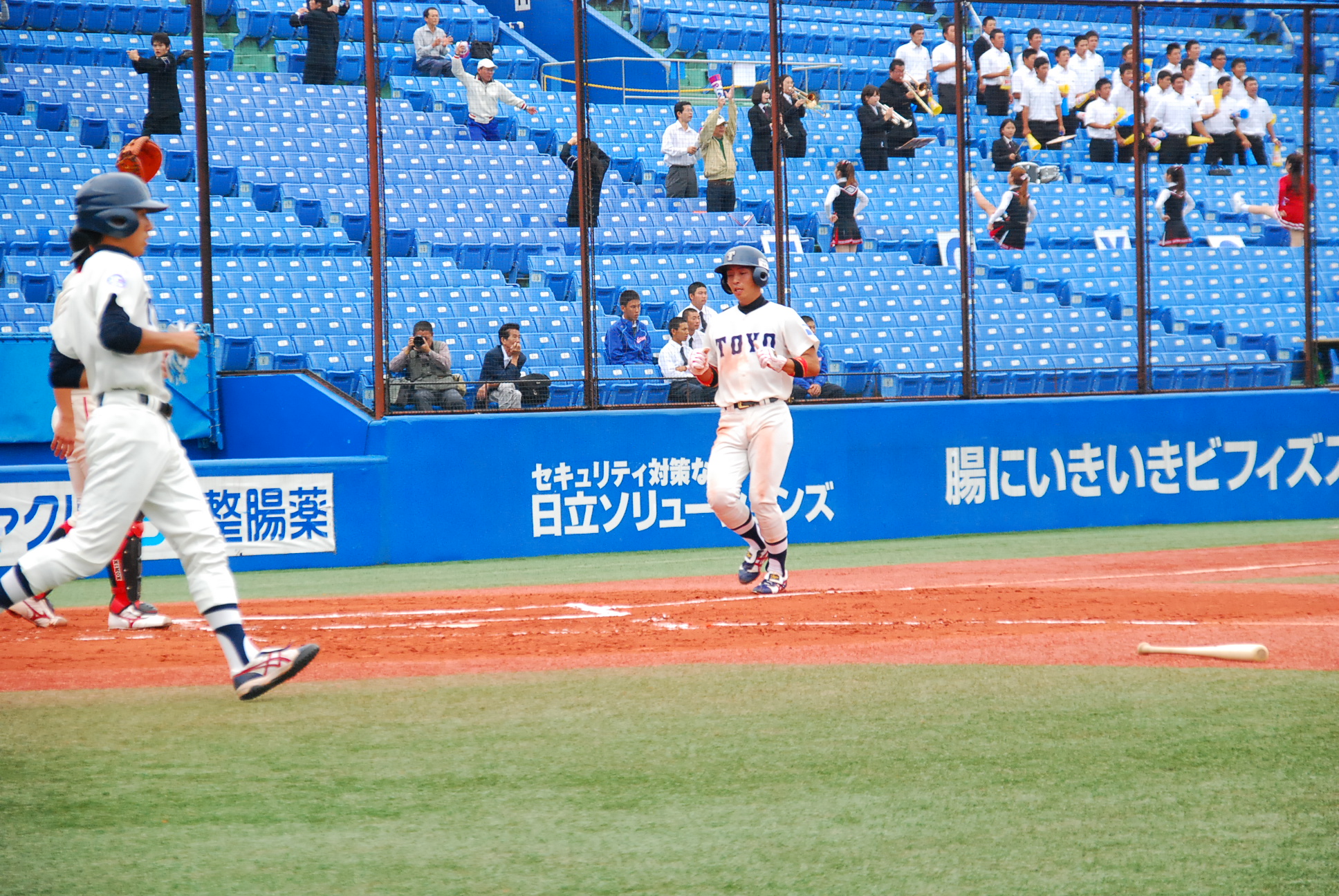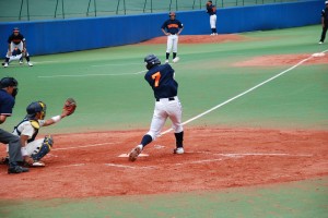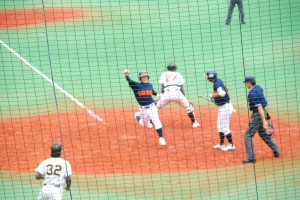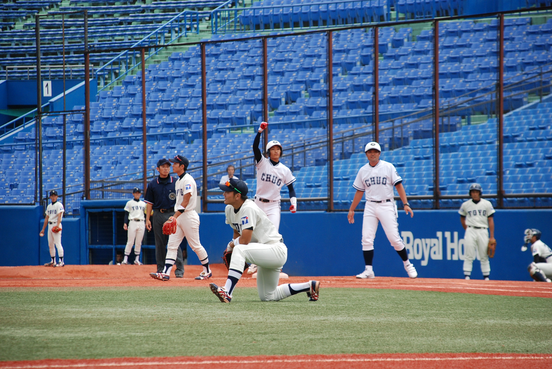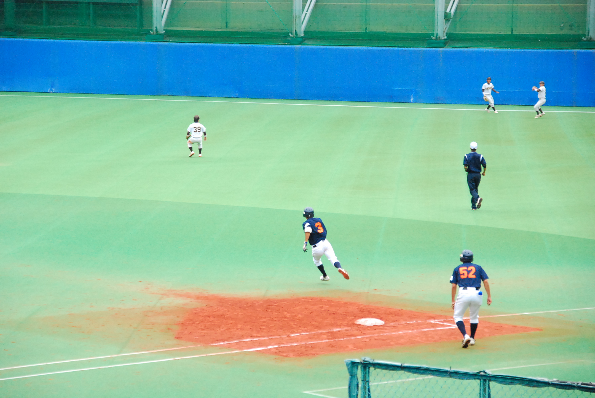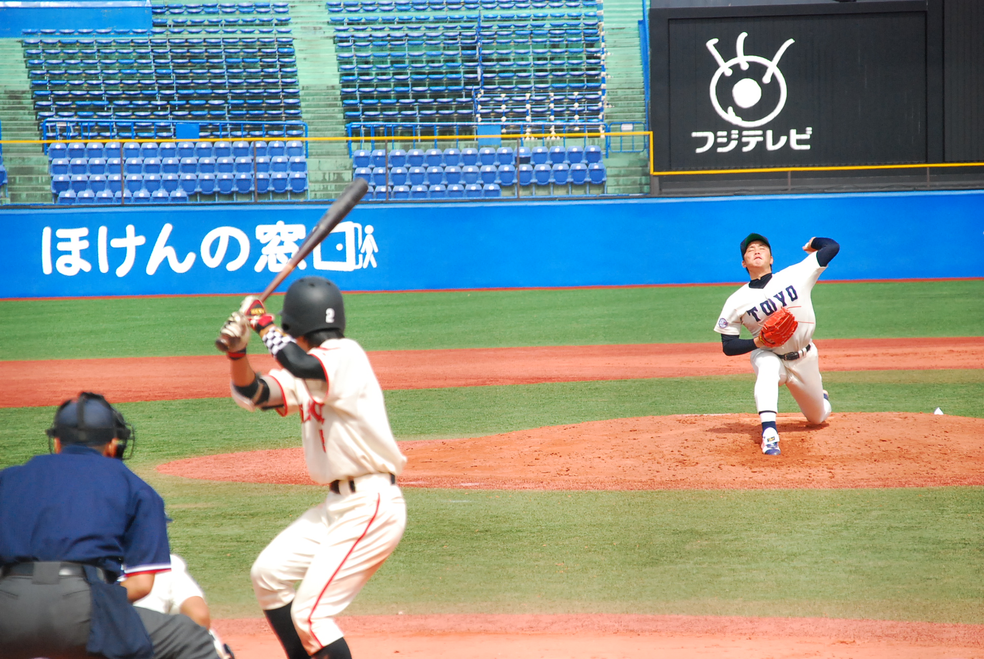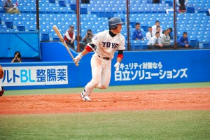 試合は序盤から動きます。先攻の東洋大学は1アウトから2番・上原選手がライト前ヒットで出塁すると、主将で3番の鈴木選手は四球を選び、ランナー1・2塁の先制のチャンスを掴みます。続く4番・戸田選手は日本大学・吉田投手の変化球の前に三振を喫すも、5番・緒方選手がライトオーバーの2塁打。2塁より上原選手が還り1点を先制。1塁ランナーの鈴木選手も果敢にホームを突きますが、日本大学ライト・平選手の好返球により本塁タッチアウト。日本大学は最小失点で切り抜けます。