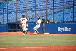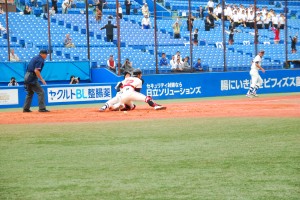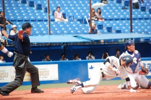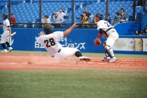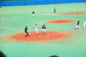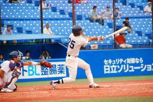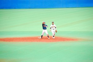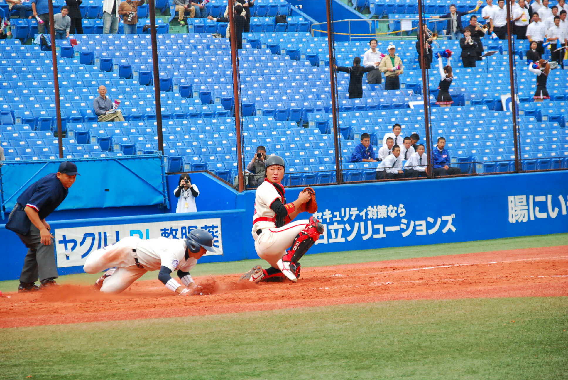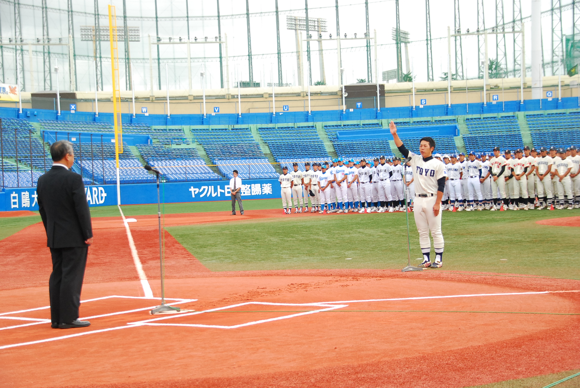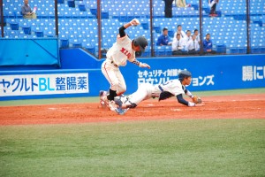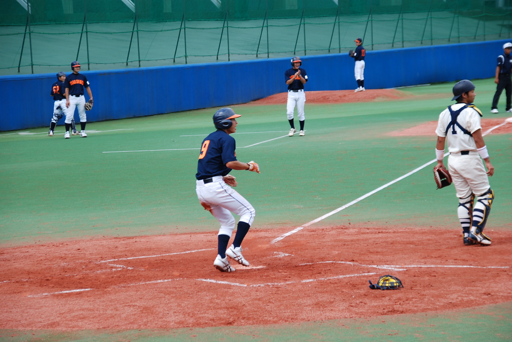 試合は序盤から動きます。先攻の東洋大学は1アウトから2番・上原選手がライト前ヒットで出塁すると、主将で3番の鈴木選手は四球を選び、ランナー1・2塁の先制のチャンスを掴みます。続く4番・戸田選手は日本大学・吉田投手の変化球の前に三振を喫すも、5番・緒方選手がライトオーバーの2塁打。2塁より上原選手が還り1点を先制。1塁ランナーの鈴木選手も果敢にホームを突きますが、日本大学ライト・平選手の好返球により本塁タッチアウト。日本大学は最小失点で切り抜けます。